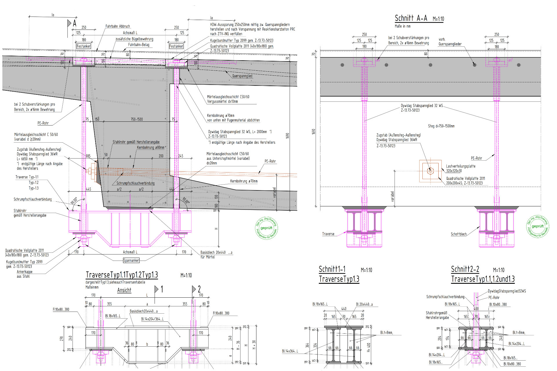 - Prüfungen von Brückennachrechnungen nach den Handlungsanweisungen "Koppelfugen" und "Spannungsrisskorrosion" sowie nach der Nachrechnungsrichtlinie des BMVI